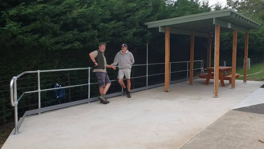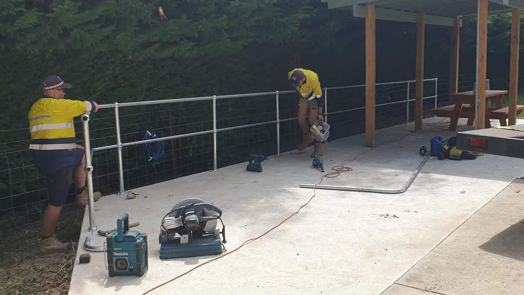 Last week, Josh and Stuart from E-Tec - Electrical Technology ran power to the gazebo giving us a powerpoint and lights switched from the station. Yesterday, Chris and the team from Alexandra Stainless installed a safety rail to the edge of the concrete slab.