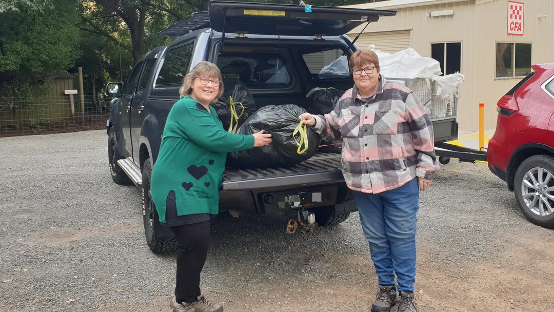 As it would happen, just as we were about to relocate to the hotel, a ute pulled in with a load of aluminium cans. Jo (right) and her friend Judy were on their way to do some photography in Marysville and had brought Jo's containers with them from Melbourne. Jo says her family regularly visits the area and has been dropping off crushed cans for years.
